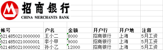 下图为银行代发工资需上传的表格:(以招商银行为例)